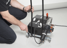 Скорость вращения прижимного/приводного ролика плавно регулируется в диапазоне 0-18 м/мин. Привод включается автоматически, когда нагреватель устанавливается в рабочее положение. Для остановки аппарата необходимо потянуть ручку регулировки положения нагревателя на себя (вынимая сопло из-под верхнего слоя ПВХ мембраны) и затем повернуть против часовой стрелки (переводя нагреватель в верхнее нерабочее положение).